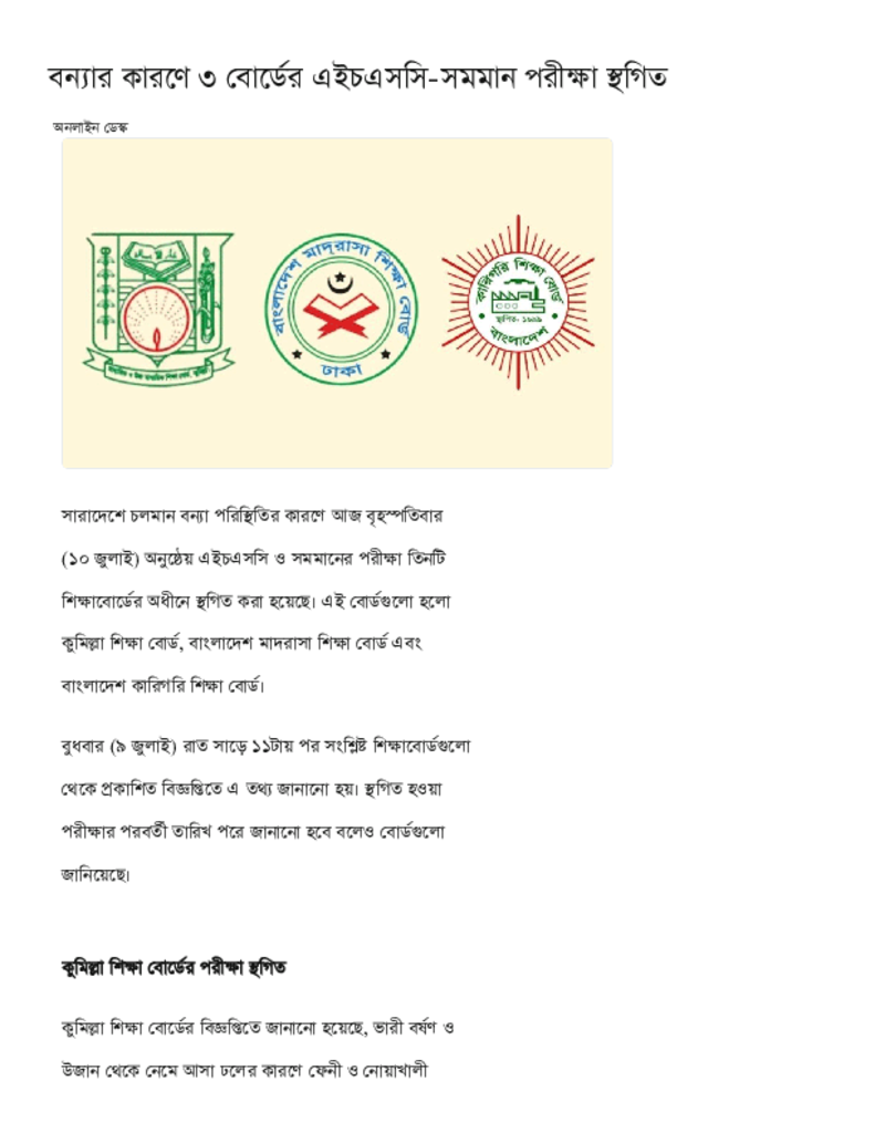 বন্যার কারণে ৩ বোর্ডের এইচএসসি-সমমান পরীক্ষা স্থগিত.pdf Published on 10 July 2025 Newspaper দৈনিক কালের কন্ঠ Category Public Examination Public Examination HSC Download