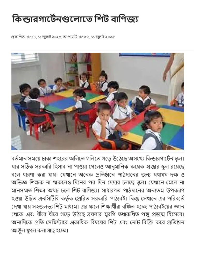 কিন্ডারগার্টেনগুলোতে শিট বাণিজ্য.pdf Published on 11 July 2025 Newspaper দৈনিক জনকণ্ঠ Category Personal Opinion / Discussion / Commentary General Education Download