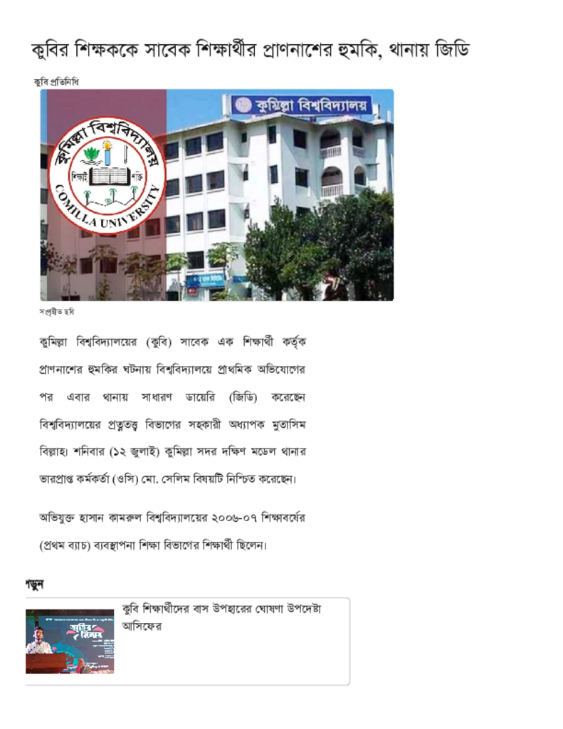 কুবির শিক্ষককে সাবেক শিক্ষার্থীর প্রাণনাশের হুমকি, থানায় জিডি.pdf Published on 12 July 2025 Newspaper দৈনিক কালের কন্ঠ Category Campus Terrorism General Education Download