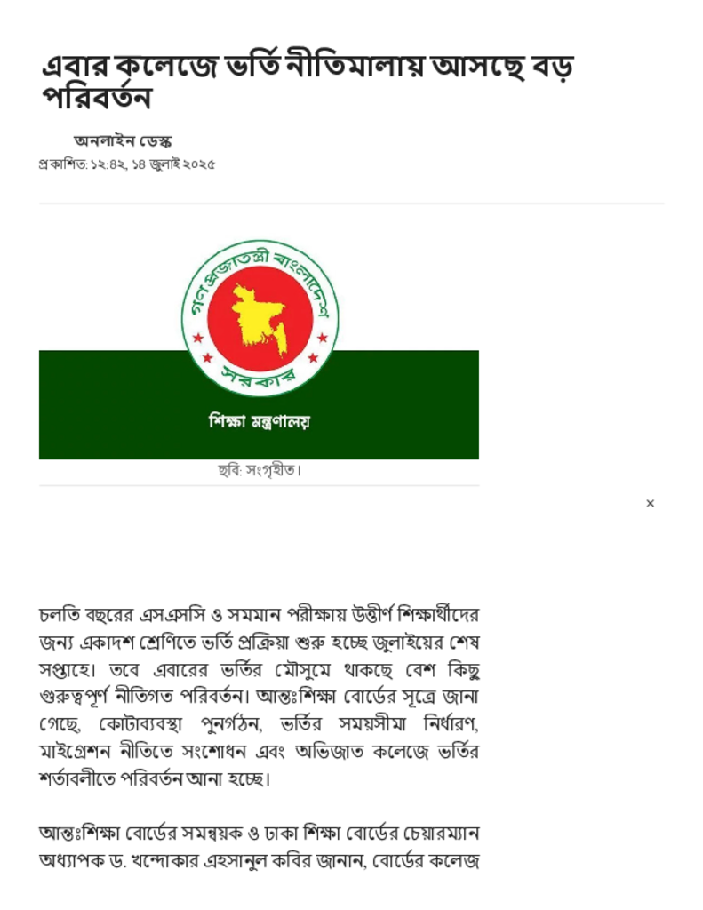 এবার কলেজে ভর্তি নীতিমালায় আসছে বড় পরিবর্তন.pdf Published on 14 July 2025 Newspaper দৈনিক জনকণ্ঠ Category Educational Ministry / Departments Download