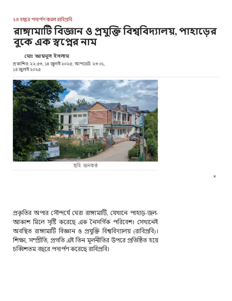 রাঙ্গামাটি বিজ্ঞান ও প্রযুক্তি বিশ্ববিদ্যালয়, পাহাড়ের বুকে এক স্বপ্নের নাম.pdf Published on 14 July 2025 Newspaper দৈনিক জনকণ্ঠ Category Personal Opinion / Discussion / Commentary General Education Download