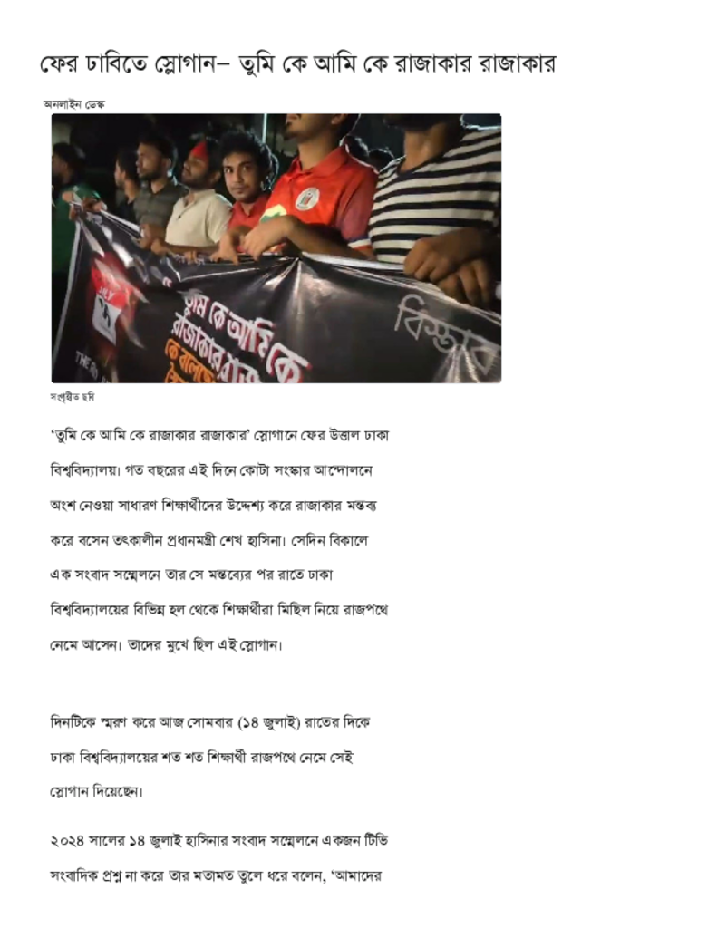 ফের ঢাবিতে স্লোগান— তুমি কে আমি কে রাজাকার রাজাকার.pdf Published on 14 July 2025 Newspaper দৈনিক কালের কন্ঠ Category Others General Education Download