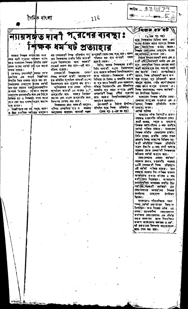 ন্যায়সঙ্গত দাবী পূরণের ব্যবস্থা: শিক্ষক ধর্মঘট প্রত্যাহার Published on Newspaper দৈনিক বাংলা Category General Education Download