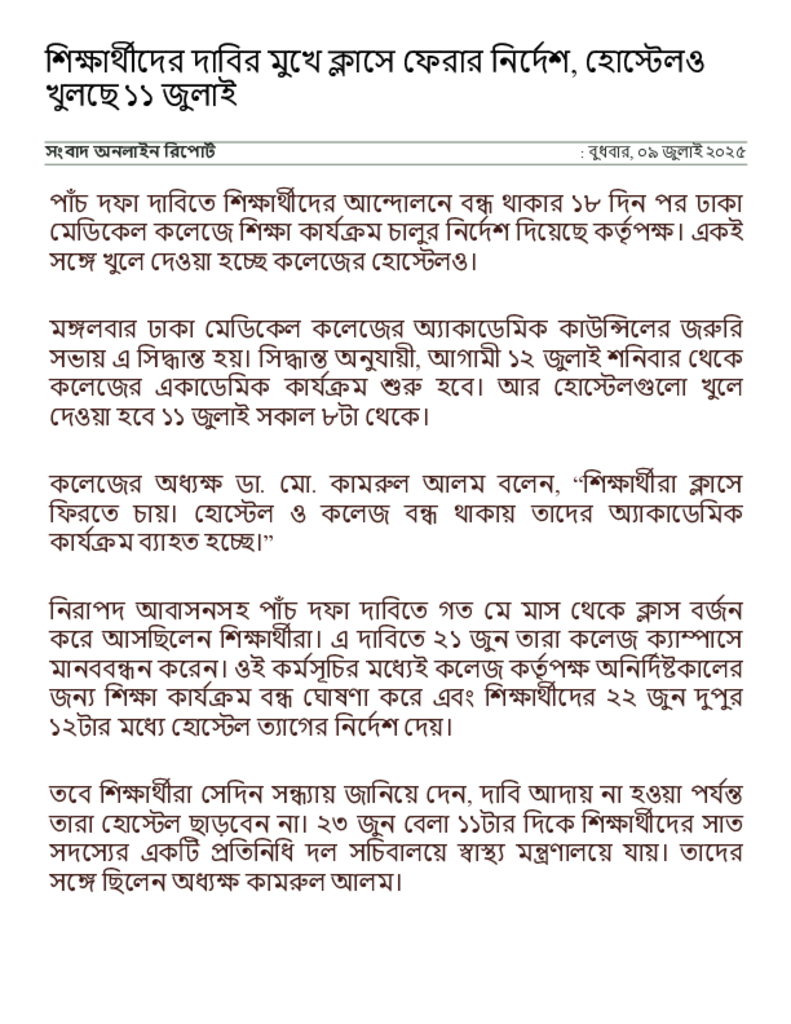 শিক্ষার্থীদের দাবির মুখে ক্লাসে ফেরার নির্দেশ, হোস্টেলও খুলছে ১১ জুলাই _ সংবাদ অনলাইন.pdf