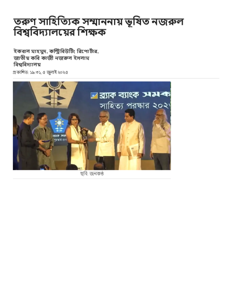 তরুণ সাহিত্যিক সম্মাননায় ভূষিত নজরুল বিশ্ববিদ্যালয়ের শিক্ষক.pdf Published on 05 July 2025 Newspaper দৈনিক জনকণ্ঠ Category Others Download