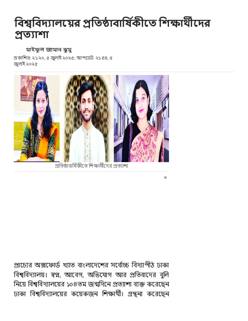 বিশ্ববিদ্যালয়ের প্রতিষ্ঠাবার্ষিকীতে শিক্ষার্থীদের প্রত্যাশা.pdf Published on 05 July 2025 Newspaper দৈনিক জনকণ্ঠ Category Personal Opinion / Discussion / Commentary General Education Download