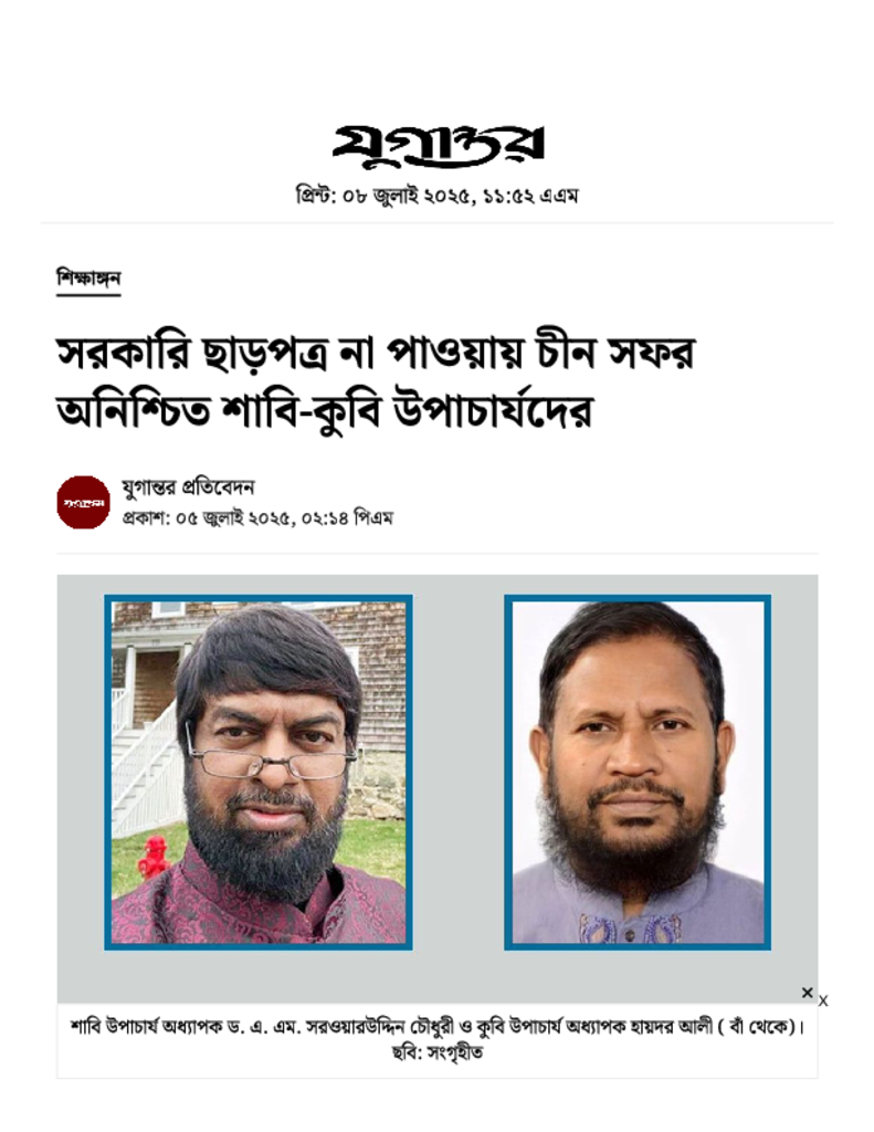 সরকারি ছাড়পত্র না পাওয়ায় চীন সফর অনিশ্চিত শাবি-কুবি উপাচার্যদের.pdf Published on 05 July 2025 Newspaper দৈনিক যুগান্তর Category Educational Ministry / Departments General Education Download