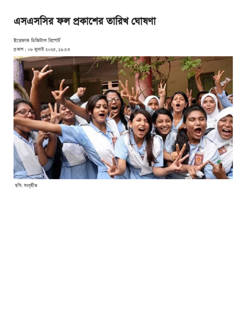 এসএসসির ফল প্রকাশের তারিখ ঘোষণা.pdf Published on 08 July 2025 Newspaper দৈনিক ইত্তেফাক Category Educational Ministry / Departments Public Examination SSC Download