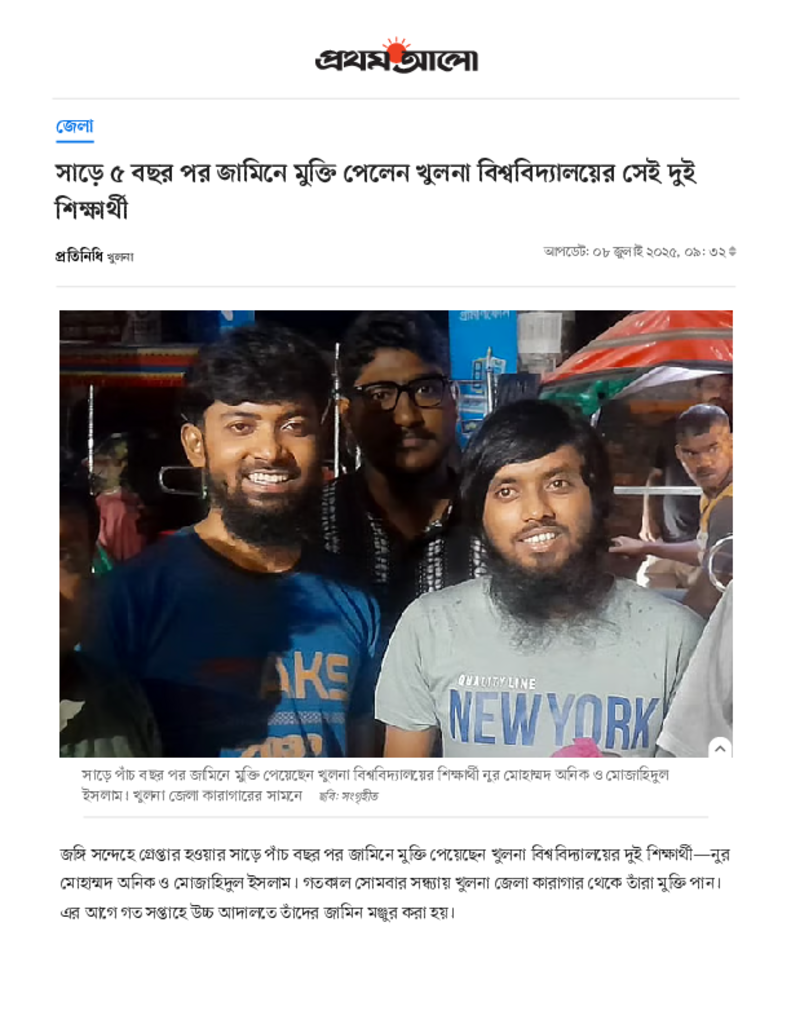 সাড়ে ৫ বছর পর জামিনে মুক্তি পেলেন খুলনা বিশ্ববিদ্যালয়ের সেই দুই শিক্ষার্থী _ প্রথম আলো.pdf Published on 08 July 2025 Newspaper দৈনিক প্রথম আলো Category Others General Education Download