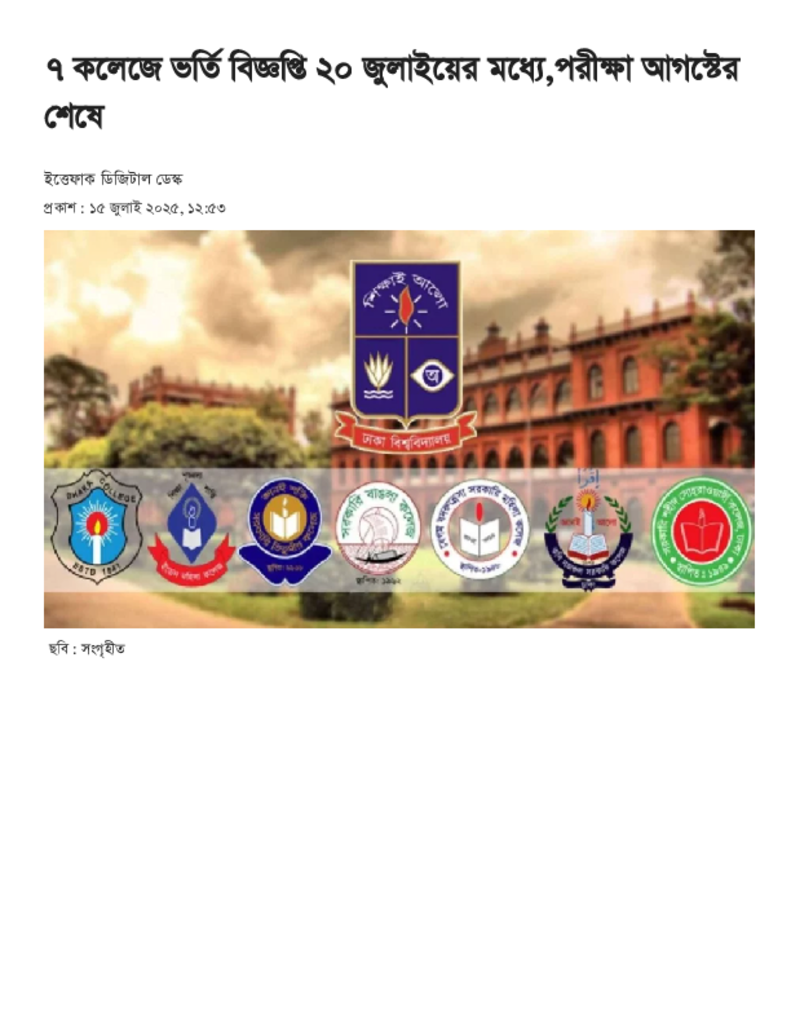 ৭ কলেজে ভর্তি বিজ্ঞপ্তি ২০ জুলাইয়ের মধ্যে,পরীক্ষা আগস্টের শেষে.pdf Published on 15 July 2025 Newspaper দৈনিক ইত্তেফাক Category Admission / Seat Problem General Education Download