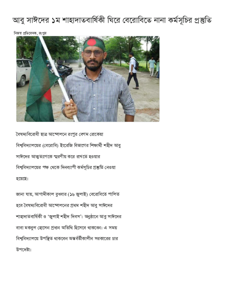 আবু সাঈদের ১ম শাহাদাতবার্ষিকী ঘিরে বেরোবিতে নানা কর্মসূচির প্রস্তুতি.pdf Published on 15 July 2025 Newspaper দৈনিক কালের কন্ঠ Category Personal Opinion / Discussion / Commentary General Education Download