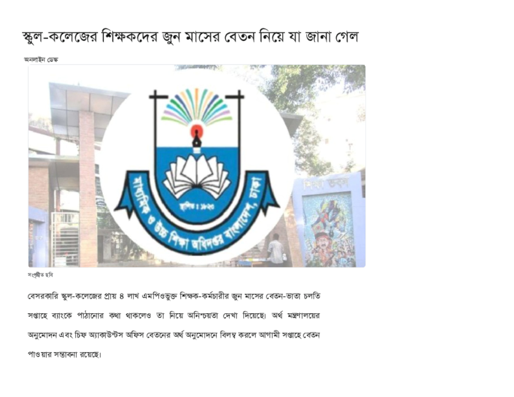 স্কুল-কলেজের শিক্ষকদের জুন মাসের বেতন নিয়ে যা জানা গেল.pdf Published on 06 July 2025 Newspaper দৈনিক কালের কন্ঠ Category Educational Ministry / Departments Download