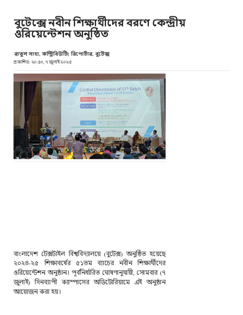 বুটেক্সে নবীন শিক্ষার্থীদের বরণে কেন্দ্রীয় ওরিয়েন্টেশন অনুষ্ঠিত.pdf Published on 07 July 2025 Newspaper দৈনিক জনকণ্ঠ Category Admission / Seat Problem General Education Download