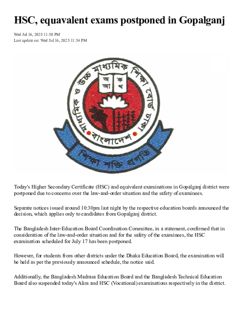HSC, equavalent exams postponed in Gopalganj _ The Daily Star.pdf Published on 16 July 2025 Newspaper The Daily Star Category Educational Ministry / Departments Public Examination HSC Download
