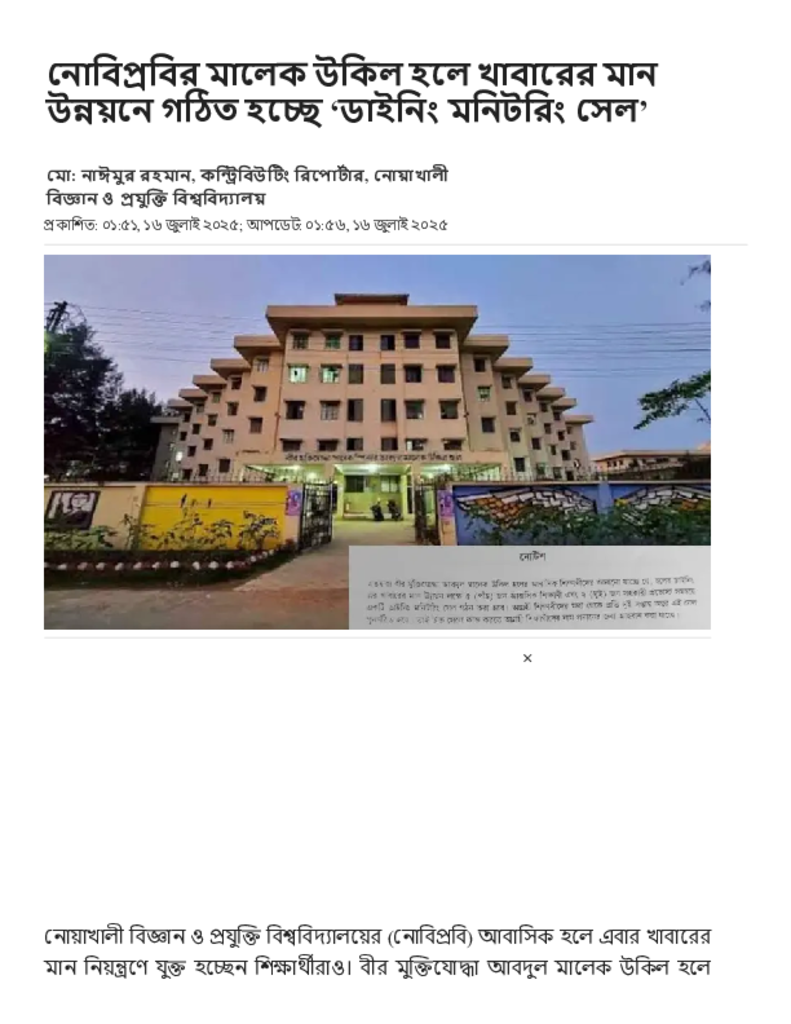 নোবিপ্রবির মালেক উকিল হলে খাবারের মান উন্নয়নে গঠিত হচ্ছে ‘ডাইনিং মনিটরিং সেল’.pdf Published on 16 July 2025 Newspaper দৈনিক জনকণ্ঠ Category Others Download