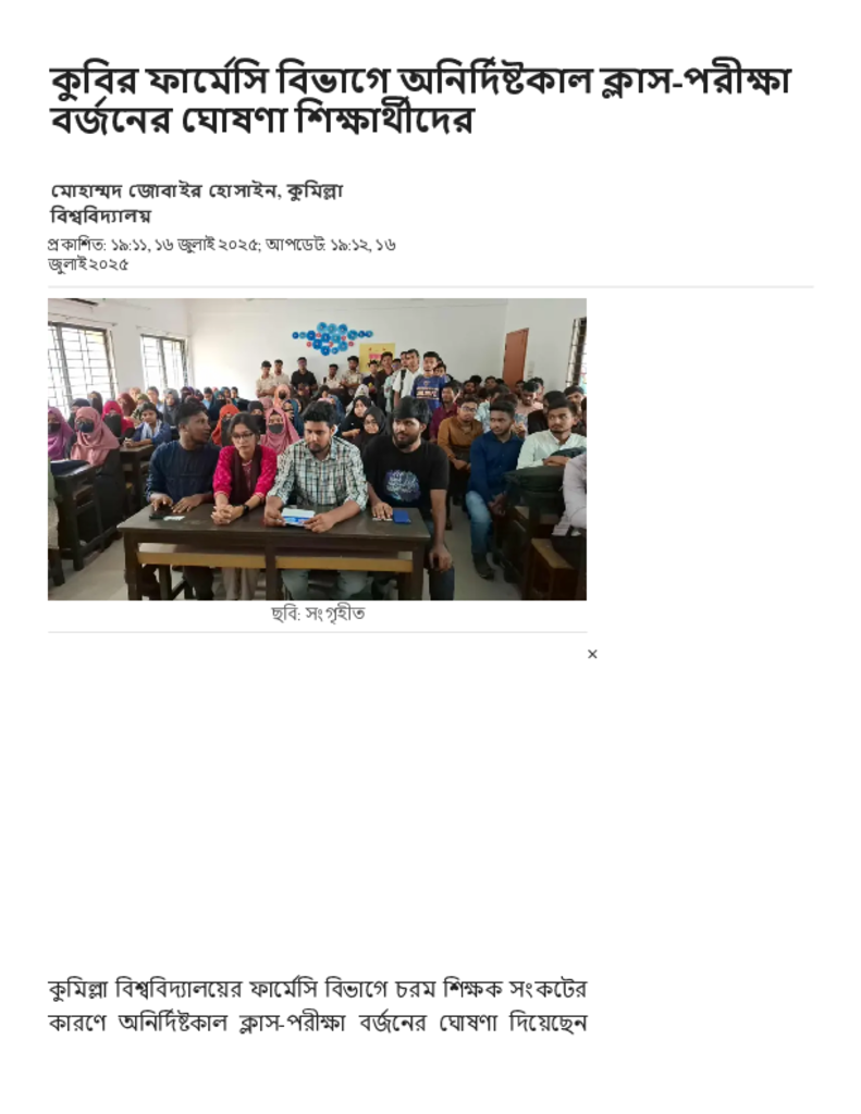 কুবির ফার্মেসি বিভাগে অনির্দিষ্টকাল ক্লাস-পরীক্ষা বর্জনের ঘোষণা শিক্ষার্থীদের.pdf Published on 16 July 2025 Newspaper দৈনিক জনকণ্ঠ Category Others General Education Download