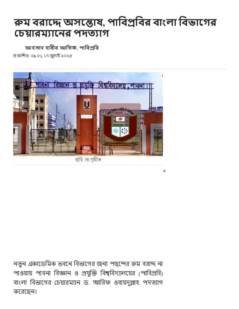 রুম বরাদ্দে অসন্তোষ, পাবিপ্রবির বাংলা বিভাগের চেয়ারম্যানের পদত্যাগ.pdf Published on 17 July 2025 Newspaper দৈনিক জনকণ্ঠ Category Personal Opinion / Discussion / Commentary General Education Download