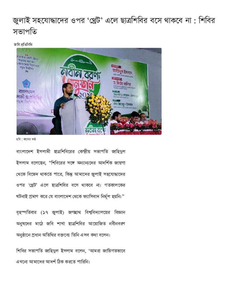 জুলাই সহযোদ্ধাদের ওপর ‘থ্রেট’ এলে ছাত্রশিবির বসে থাকবে না _ শিবির সভাপতি.pdf Published on 17 July 2025 Newspaper দৈনিক কালের কন্ঠ Category Student Politics General Education Download