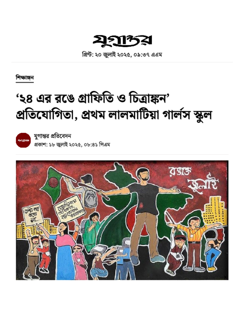 ‘২৪ এর রঙে গ্রাফিতি ও চিত্রাঙ্কন’ প্রতিযোগিতা, প্রথম লালমাটিয়া গার্লস স্কুল.pdf Published on 18 July 2025 Newspaper দৈনিক যুগান্তর Category Others General Education Download