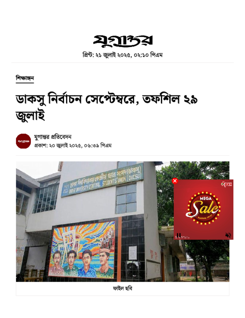 ডাকসু নির্বাচন সেপ্টেম্বরে, তফশিল ২৯ জুলাই.pdf Published on 20 July 2025 Newspaper দৈনিক যুগান্তর Category Student Politics General Education Download