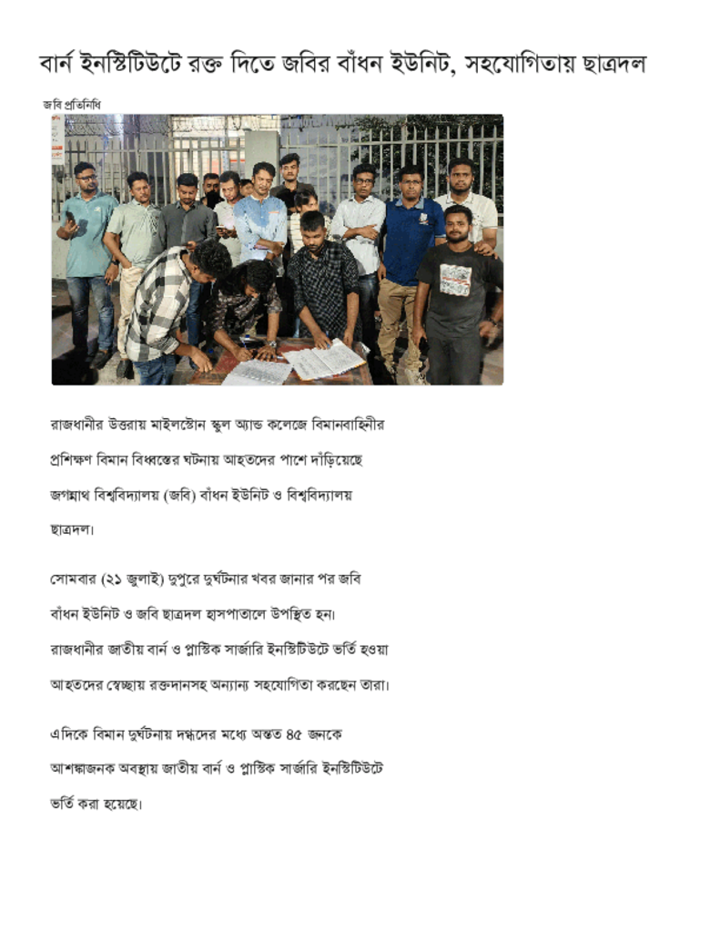 বার্ন ইনস্টিটিউটে রক্ত দিতে জবির বাঁধন ইউনিট, সহযোগিতায় ছাত্রদল.pdf Published on 22 July 2025 Newspaper দৈনিক কালের কন্ঠ Category Others Download