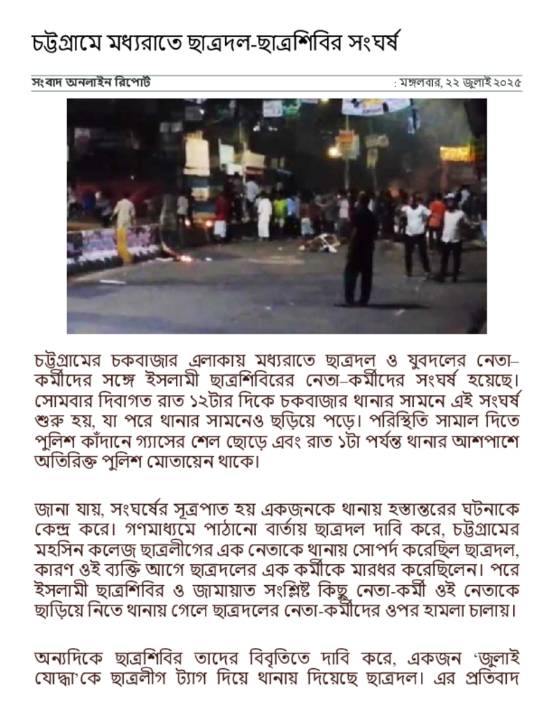 চট্টগ্রামে মধ্যরাতে ছাত্রদল-ছাত্রশিবির সংঘর্ষ _ সংবাদ অনলাইন.pdf Published on 22 July 2025 Newspaper দৈনিক সংবাদ Category Campus Terrorism General Education Download