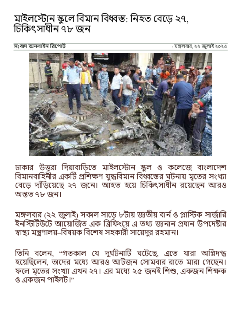 মাইলস্টোন স্কুলে বিমান বিধ্বস্ত_ নিহত বেড়ে ২৭, চিকিৎসাধীন ৭৮ জন.pdf Published on 22 July 2025 Newspaper দৈনিক সংবাদ Category Others Download