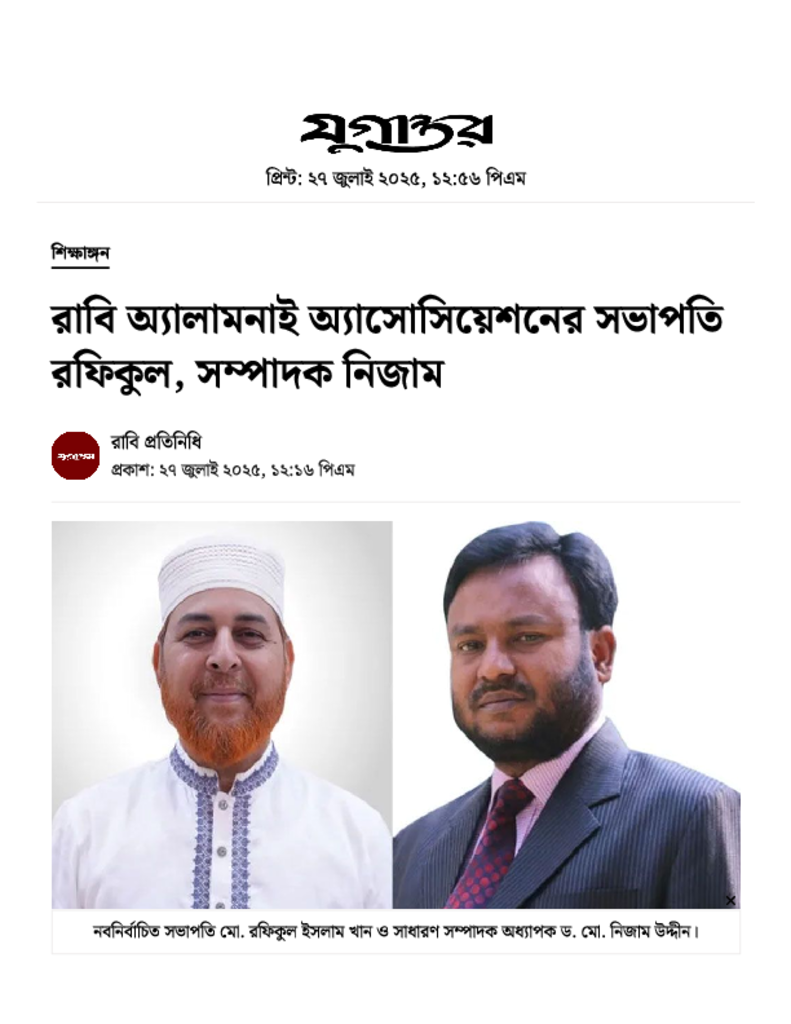 রাবি অ্যালামনাই অ্যাসোসিয়েশনের সভাপতি রফিকুল, সম্পাদক নিজাম.pdf Published on 27 July 2025 Newspaper দৈনিক যুগান্তর Category Others General Education Download