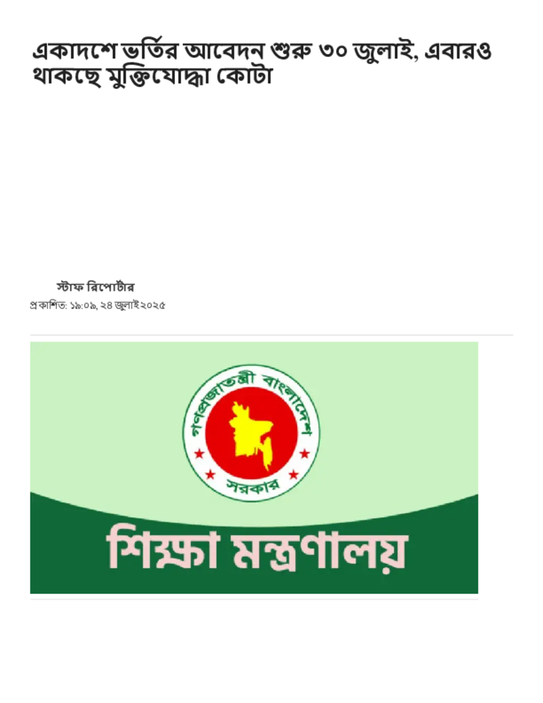 একাদশে ভর্তির আবেদন শুরু ৩০ জুলাই, এবারও থাকছে মুক্তিযোদ্ধা কোটা.pdf Published on 24 July 2025 Newspaper দৈনিক জনকণ্ঠ Category Admission / Seat Problem General Education Download
