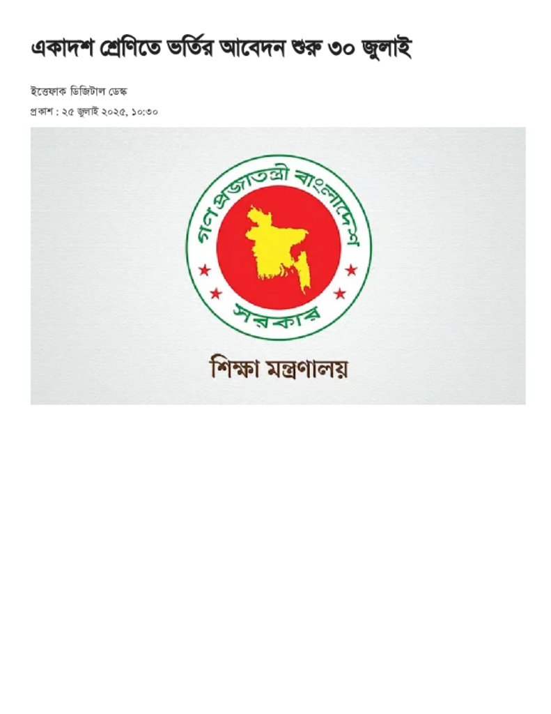 একাদশ শ্রেণিতে ভর্তির আবেদন শুরু ৩০ জুলাই.pdf Published on 25 July 2025 Newspaper দৈনিক ইত্তেফাক Category Admission / Seat Problem General Education Download