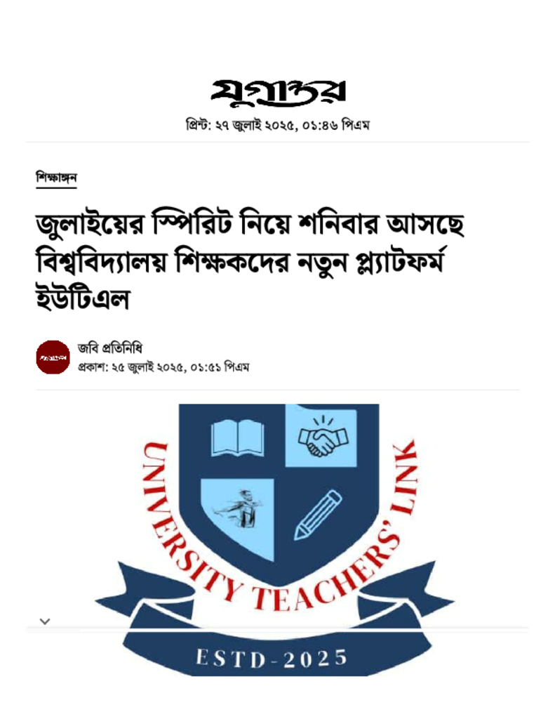 জুলাইয়ের স্পিরিট নিয়ে বিশ্ববিদ্যালয় শিক্ষকদের নতুন প্ল্যাটফর্ম ইউটিএল.pdf Published on 25 July 2025 Newspaper দৈনিক যুগান্তর Category Others General Education Download