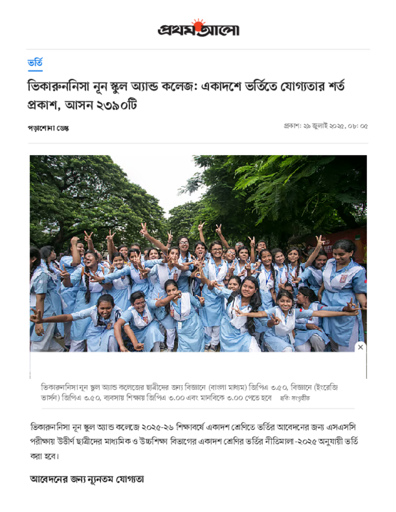 ভিকারুননিসা নূন স্কুল অ্যান্ড কলেজ_ একাদশে ভর্তিতে যোগ্যতার শর্ত প্রকাশ.pdf Published on 29 July 2025 Newspaper দৈনিক প্রথম আলো Category Admission / Seat Problem General Education Download