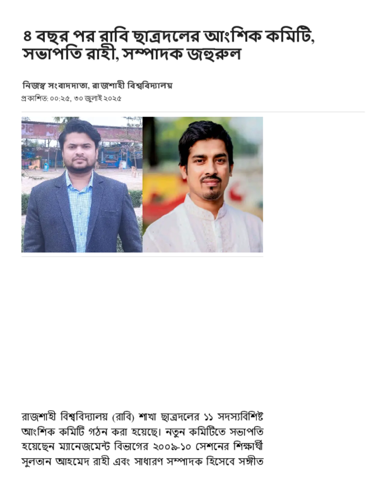 ৪ বছর পর রাবি ছাত্রদলের আংশিক কমিটি, সভাপতি রাহী, সম্পাদক জহুরুল.pdf Published on 30 July 2025 Newspaper দৈনিক জনকণ্ঠ Category Student Politics General Education Download