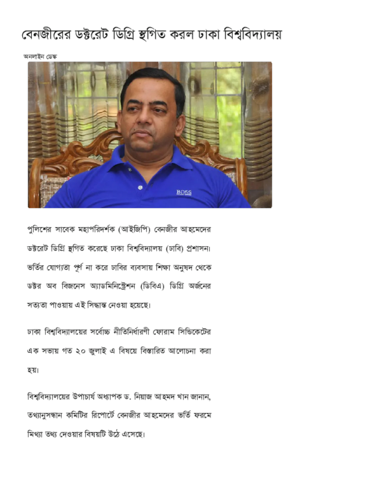 বেনজীরের ডক্টরেট ডিগ্রি স্থগিত করল ঢাকা বিশ্ববিদ্যালয়.pdf Published on 01 August 2025 Newspaper দৈনিক কালের কন্ঠ Category Educational Ministry / Departments General Education Download