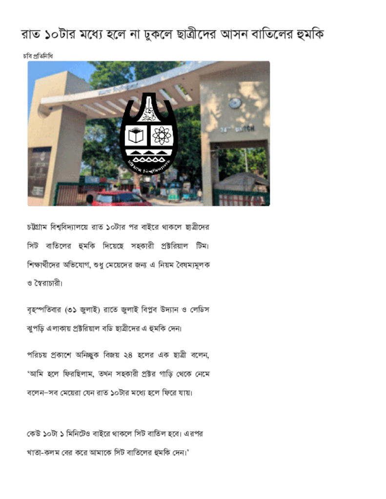 রাত ১০টার মধ্যে হলে না ঢুকলে ছাত্রীদের আসন বাতিলের হুমকি.pdf Published on 01 August 2025 Newspaper দৈনিক কালের কন্ঠ Category Admission / Seat Problem General Education Download