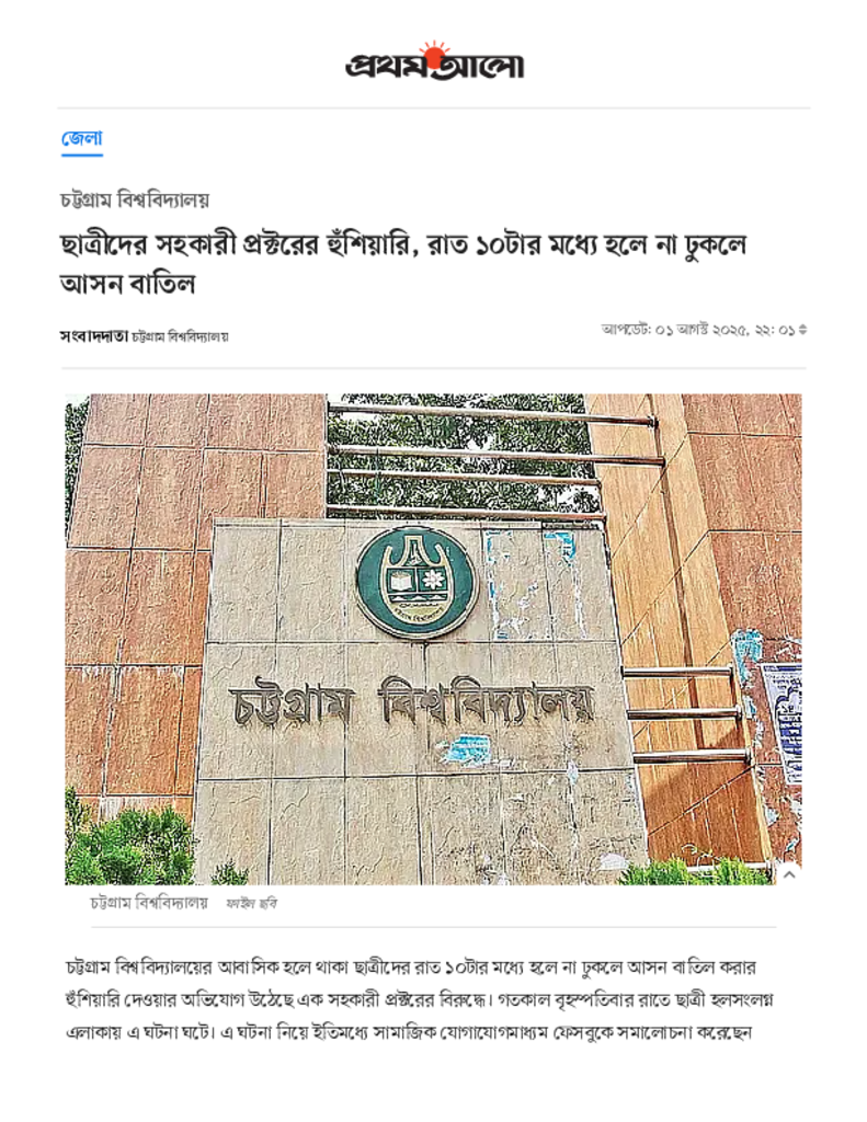 ছাত্রীদের সহকারী প্রক্টরের হুঁশিয়ারি, রাত ১০টার মধ্যে হলে না ঢুকলে আসন বাতিল.pdf Published on 01 August 2025 Newspaper দৈনিক প্রথম আলো Category Admission / Seat Problem General Education Download