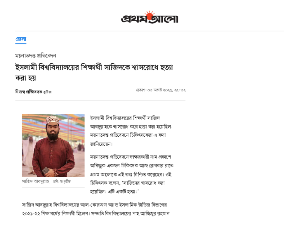 ইসলামী বিশ্ববিদ্যালয়ের শিক্ষার্থী সাজিদকে শ্বাসরোধে হত্যা করা হয়.pdf Published on 03 August 2025 Newspaper দৈনিক প্রথম আলো Category Campus Terrorism General Education Download