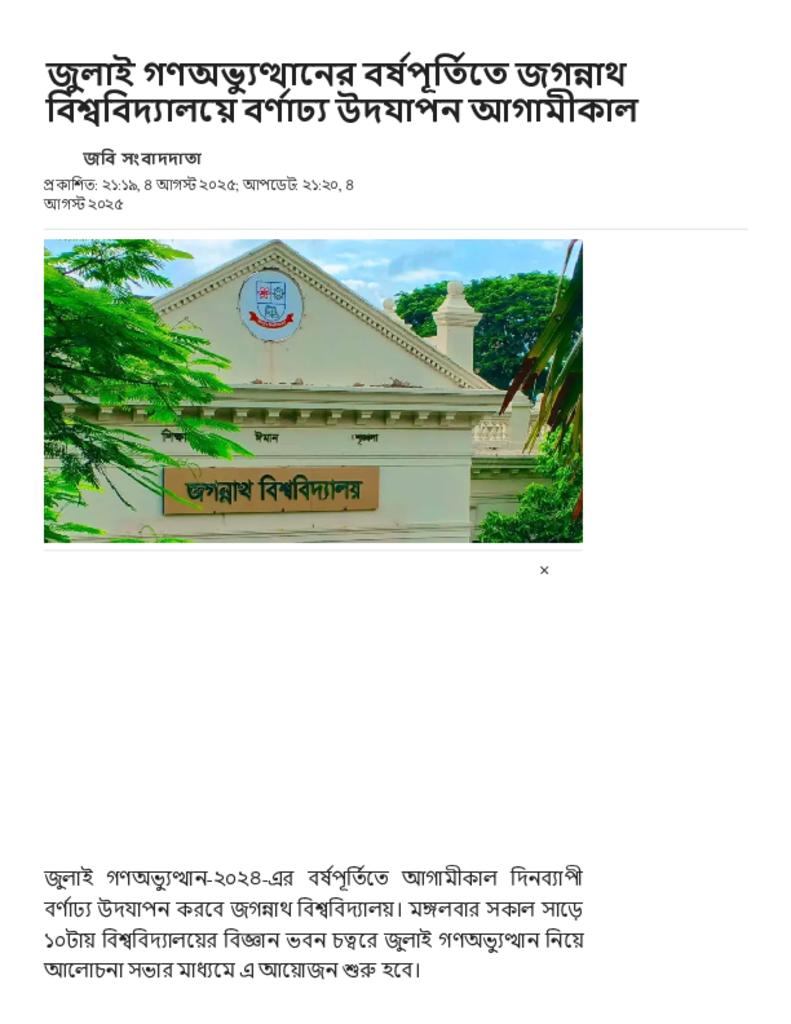 জুলাই গণঅভ্যুত্থানের বর্ষপূর্তিতে জগন্নাথ বিশ্ববিদ্যালয়ে বর্ণাঢ্য উদযাপন আগামীকাল.pdf Published on 04 August 2025 Newspaper দৈনিক জনকণ্ঠ Category Others General Education Download