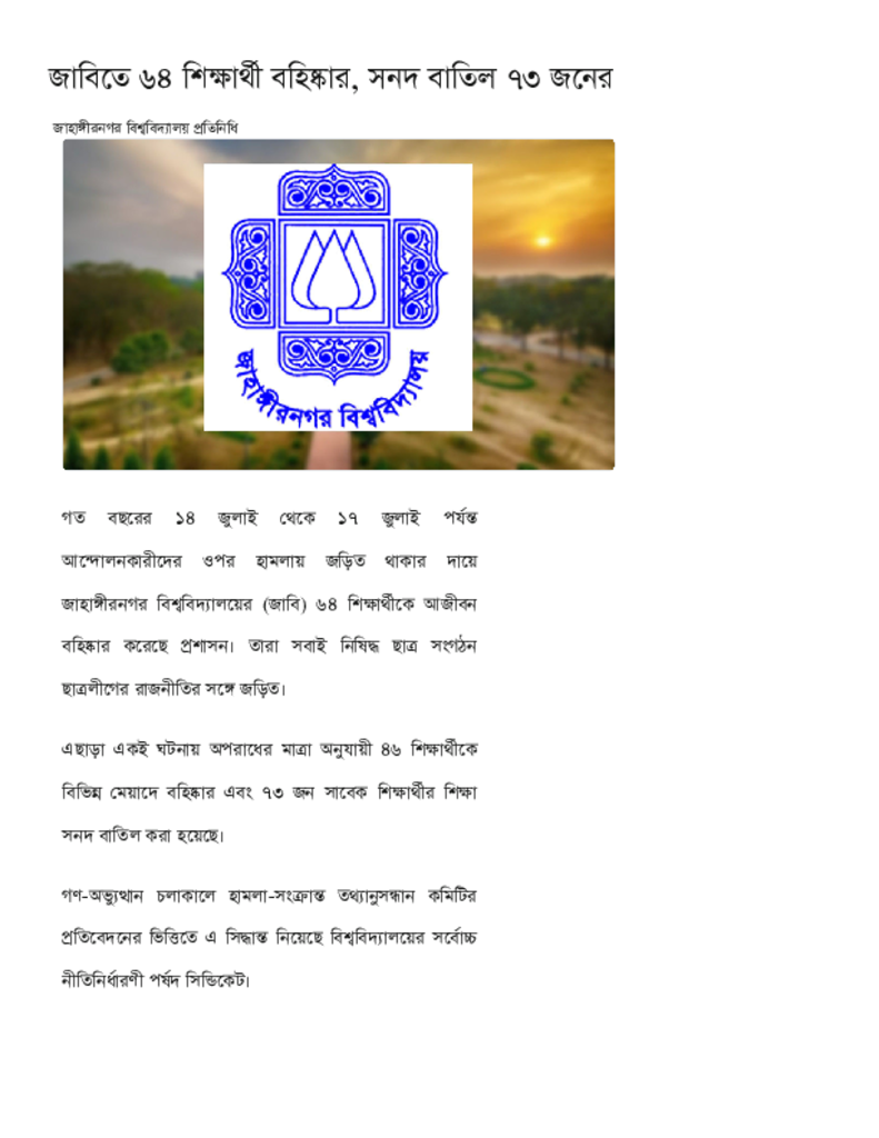 জাবিতে ৬৪ শিক্ষার্থী বহিষ্কার, সনদ বাতিল ৭৩ জনের.pdf Published on 05 August 2025 Newspaper দৈনিক কালের কন্ঠ Category Others General Education Download