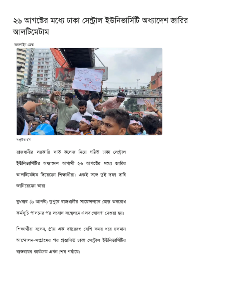২৬ আগস্টের মধ্যে ঢাকা সেন্ট্রাল ইউনিভার্সিটি অধ্যাদেশ জারির আলটিমেটাম.pdf Published on 06 August 2025 Newspaper দৈনিক কালের কন্ঠ Category Educational Ministry / Departments Download