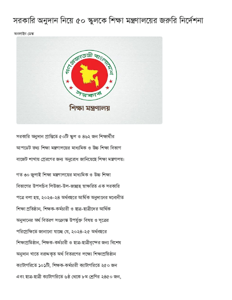সরকারি অনুদান নিয়ে ৫০ স্কুলকে শিক্ষা মন্ত্রণালয়ের জরুরি নির্দেশনা.pdf Published on 06 August 2025 Newspaper দৈনিক কালের কন্ঠ Category Educational Ministry / Departments Download