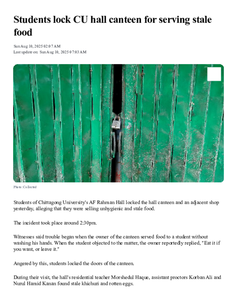 Students lock CU hall canteen for serving stale, unhygienic food _ undefined.pdf Published on 09 August 2025 Newspaper The Daily Star Category Others General Education Download