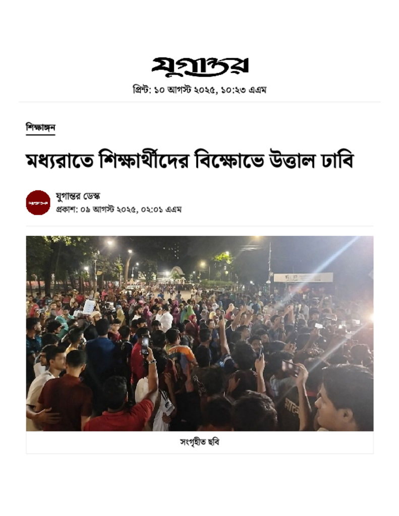 মধ্যরাতে শিক্ষার্থীদের বিক্ষোভে উত্তাল ঢাবি.pdf Published on 09 August 2025 Newspaper দৈনিক যুগান্তর Category Others General Education Download