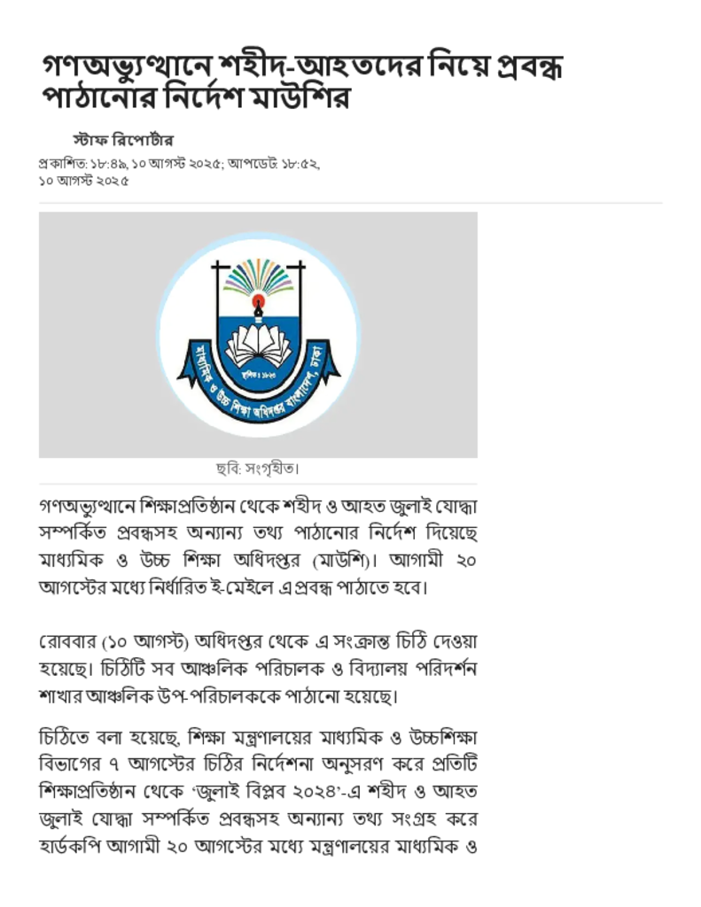 গণঅভ্যুত্থানে শহীদ-আহতদের নিয়ে প্রবন্ধ পাঠানোর নির্দেশ মাউশির.pdf Published on 10 August 2025 Newspaper দৈনিক জনকণ্ঠ Category Educational Ministry / Departments Download