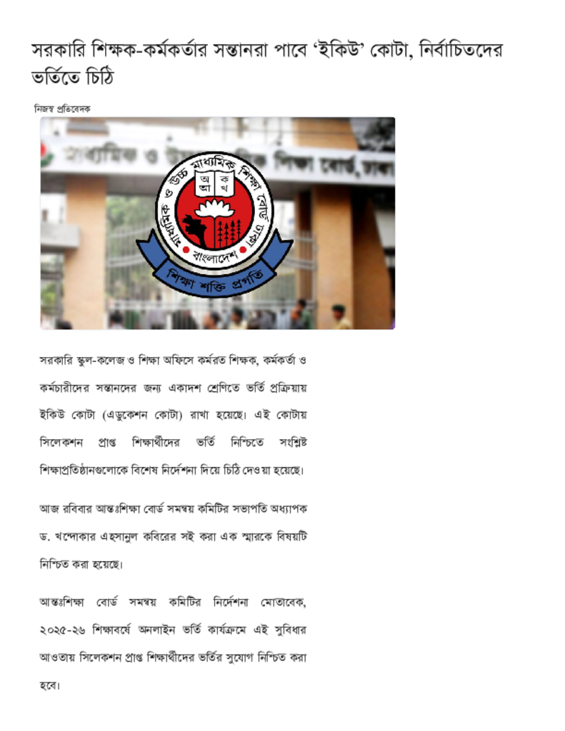 সরকারি শিক্ষক-কর্মকর্তার সন্তানরা পাবে ‘ইকিউ’ কোটা, নির্বাচিতদের ভর্তিতে চিঠি.pdf Published on 10 August 2025 Newspaper দৈনিক কালের কন্ঠ Category Educational Ministry / Departments Download