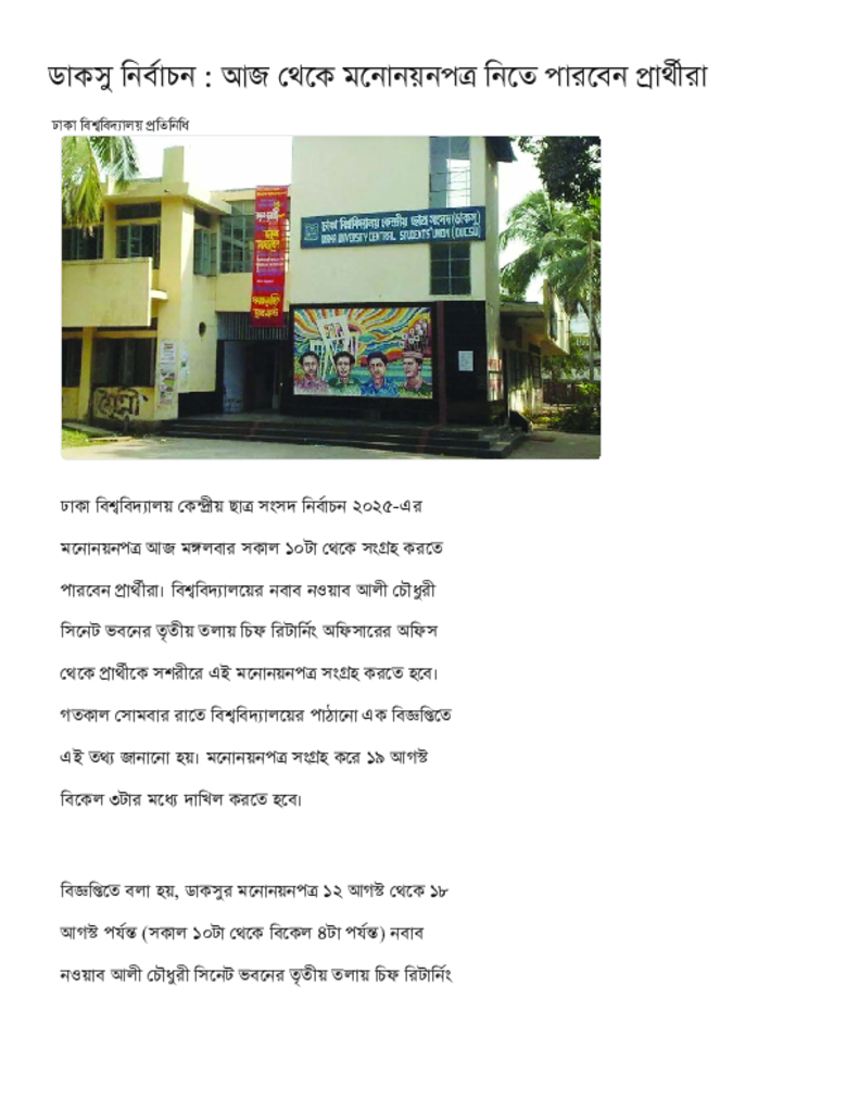 ডাকসু নির্বাচন _ আজ থেকে মনোনয়নপত্র নিতে পারবেন প্রার্থীরা.pdf Published on 12 August 2025 Newspaper দৈনিক কালের কন্ঠ Category Student Politics General Education Download