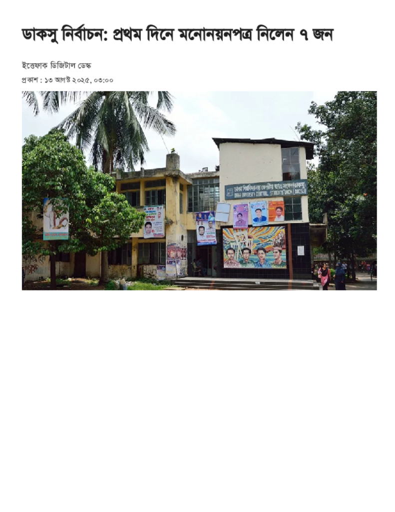 ডাকসু নির্বাচন_ প্রথম দিনে মনোনয়নপত্র নিলেন ৭ জন.pdf Published on 13 August 2025 Newspaper দৈনিক ইত্তেফাক Category Student Politics General Education Download