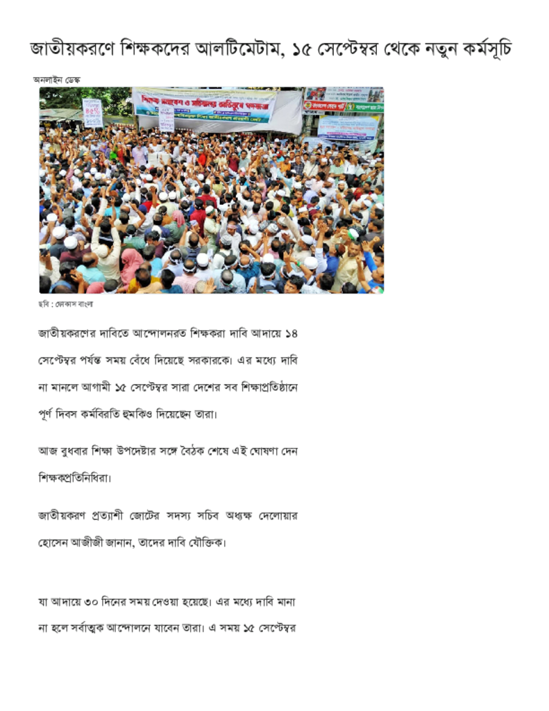 জাতীয়করণে শিক্ষকদের আলটিমেটাম, ১৫ সেপ্টেম্বর থেকে নতুন কর্মসূচি.pdf Published on 13 August 2025 Newspaper দৈনিক কালের কন্ঠ Category Educational Ministry / Departments Download