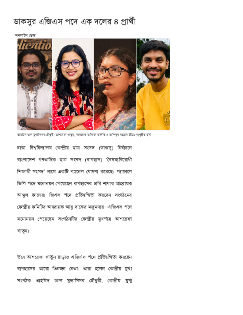 ডাকসুর এজিএস পদে এক দলের ৪ প্রার্থী.pdf Published on 22 August 2025 Newspaper দৈনিক কালের কন্ঠ Category Student Politics Download
