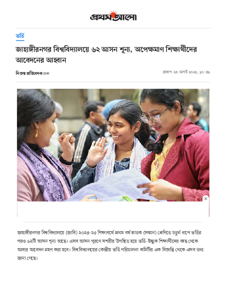 জাহাঙ্গীরনগর বিশ্ববিদ্যালয়ে ৬২ আসন শূন্য, অপেক্ষমাণ শিক্ষার্থীদের আবেদনের আহ্বান.pdf Published on 23 August 2025 Newspaper দৈনিক প্রথম আলো Category Admission / Seat Problem General Education Download